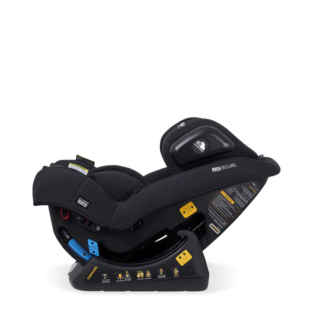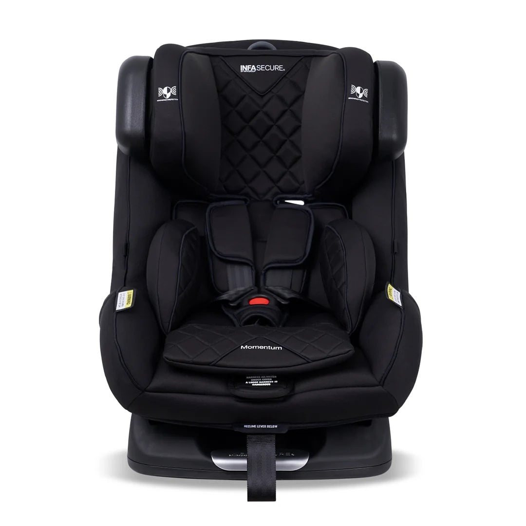 The InfaSecure Momentum More is a versatile 0-4 year child car seat that combines top safety features with comfort and style. Designed as a compact convertible restraint, it supports extended rearward-facing travel for enhanced protection. Reinforced with steel in the upper shell and headrest, it offers durability without added bulk, fitting easily in most vehicles and ideal for three-across seating. The ISOFix compatible system ensures secure installation. Featuring Active Bamboo fabric for moisture-wicking comfort, Head Impact Protection foam, and Air Barrier Cushion technology for superior side impact safety. The Lift & Adjust headrest and harness grow with your child, while the Easy Recline function offers four adjustable positions for optimal comfort.