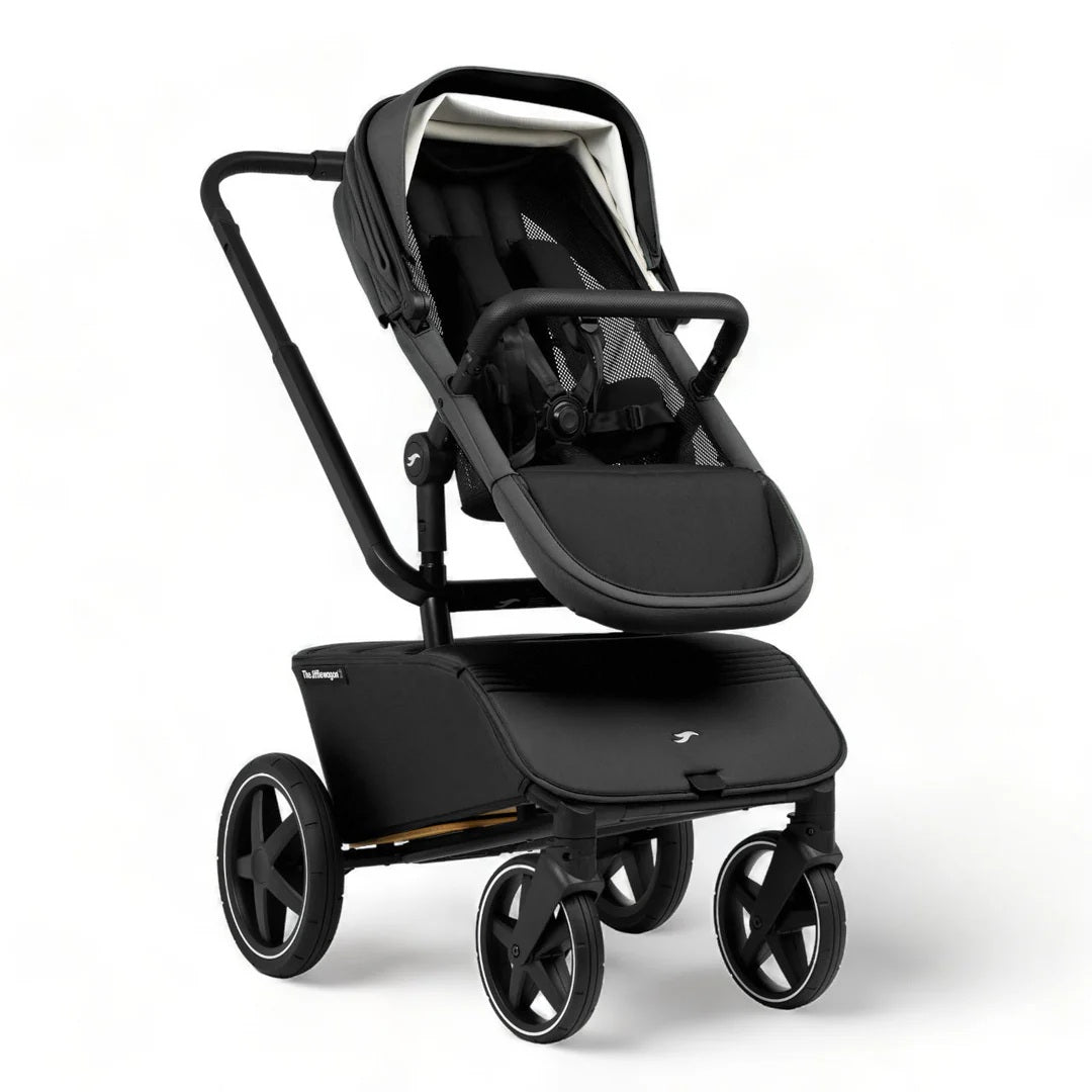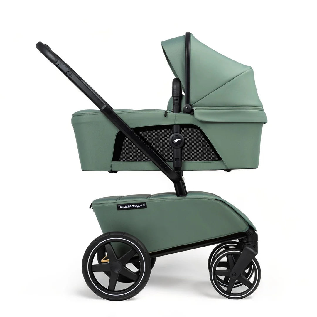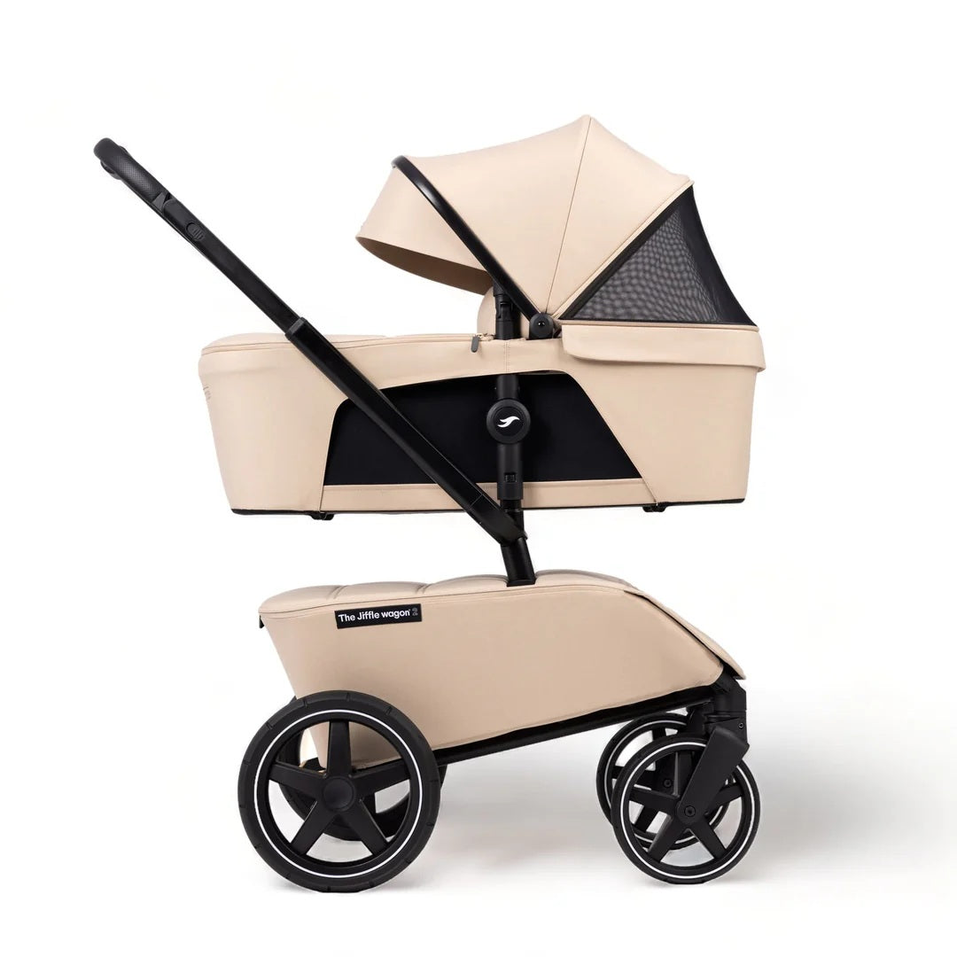 The Jiffle Wagon 2 is a versatile 6-in-1 stroller designed to adapt as your family grows. It combines capsule compatibility, bassinet, seat, duo setup, ride-along board, and wagon cart functionality in one innovative product. It offers ample storage with a spacious 60L lockable cargo area and smooth under-seat suspension for comfortable rides on any terrain. The bassinet features superior ventilation and visibility, complemented by summer and winter seat options. Compatible with multiple capsule brands via adapters, the Jiffle Wagon folds flat quickly, with or without wheels, and fits easily into your car boot even when loaded.