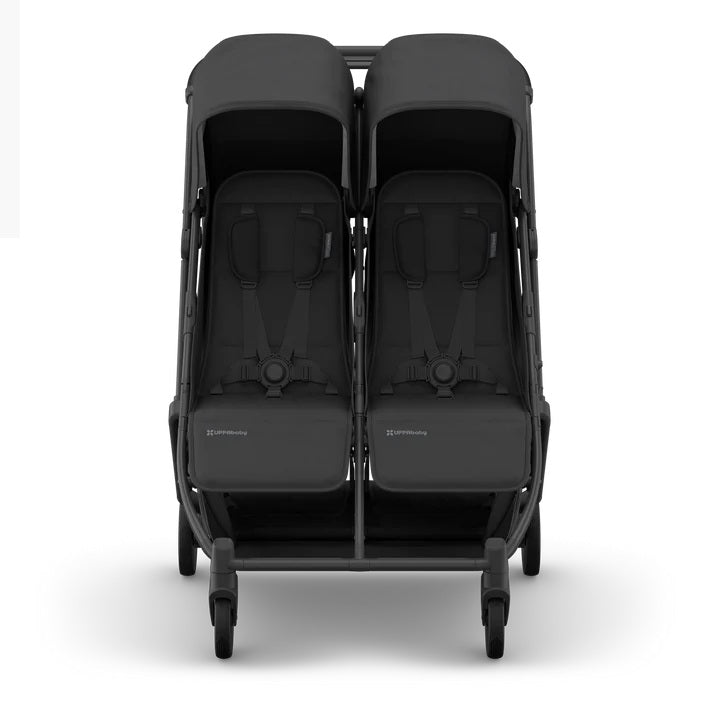 The UPPAbaby Minu Duo is a side-by-side stroller designed to comfortably accommodate two children, ideal for families with twins or siblings. Its narrow 73 cm width allows easy passage through standard doorways and tight spaces. The stroller features a one-hand, one-step fold with a locking latch and an integrated carry handle for effortless transport. Equipped with 5-point adjustable harnesses, UPF 50+ water-repellent canopies, and one-handed recline and footrest adjustments, it ensures comfort and protection. Additional highlights include a hidden pocket for an Air Tracker, spacious storage up to 11.3 kg, and a durable frame made from full-grain leather and aluminium. Certified GREENGUARD® Gold, it supports children up to 22.7 kg.