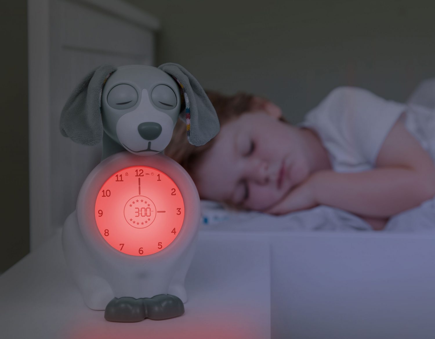 Davy The Dog uses a traffic light system to teach children when to stay in bed and when it’s okay to get up. A red screen with closed eyes signals bedtime, orange indicates a 30-minute wait, and green with open eyes means it’s time to rise. You can schedule nap times from 30 to 180 minutes and set a bedtime, with the option to manually activate the red light if needed. The dimmable nightlight can run all night or turn off automatically after a set time. Davy offers three soothing sounds with adjustable volume for waking, or a silent green light alert.